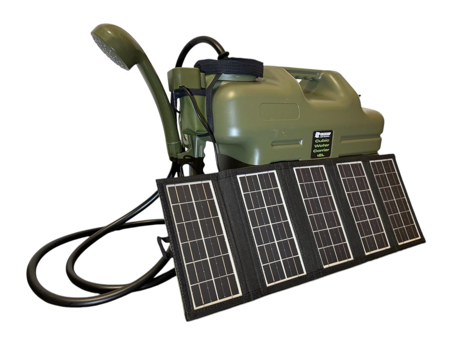 - Holdcarp Set je kompletní sadou pro kempování obsahující sprchu, kanystr a solární panel